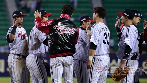 13일 서울 잠실야구장에서 열린 '2016 타이어뱅크 KBO리그' LG 트윈스와 SK 와이번스의 경기에서 LG가 2-1 짜릿한 역전승을 거뒀다. 경기 후 LG 선수들이 기쁨을 나누고 있다.