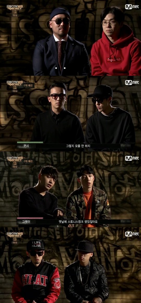 1회는 심사위원들 소개로 시작됐다. 특히 오랜만의 방송 출연에 긴장한 듯한 길과 이를 묵묵하게 바라보는 정준하의 표정이 화면에 잡히면서 시선을 사로잡았다. 길은 제작진과의 인터뷰에서 "굉장히 오래 쉬셨잖아요"라는 매드클라운 말에 "굉장히는 아니고요. 3년이요"라고 답했다. 이어 매드클라운과 친하냐는 MC 질문에 "안 친합니다"라고 단호히 말해 재미를 더했다. 쿠시-자이언티 팀은 평화주의자였다. 프로그램을 디스하거나 욕설을 퍼붓는 일부 참가자들에 대해 "감정을 왜 그렇게 허비하나. 힐 더 월드(Heal the world)"를 외치며 캐릭터를 확실하게 했다. 사이먼 도미닉은 과거 프로그램을 디스한 데 대해 "내가 심사위원으로 참여하면서 욕을 많이 먹었다. 인정한다. 하지만 '쇼미더머니' 출연 안 해도 돈 번다는 내 과거 발언은 지금도 유효하다"고 소신을 지켰다. 훈훈한 외모의 그레이는 여성 참가자들의 평정심을 흔들며 '쇼미더머니5'의 얼굴로 등극했다.