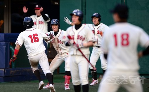 17일 서울 목동야구장에서 '제 70회 황금사자기 전국고교야구대회' 덕수고와 마산 용마고의 결승전이 열렸다. 4회초 무사 1,2루에서 마산 용마고의 실책으로 득점에 성공한 덕수고 남영재(16번)가 동료들의 축하를 받고 있다.