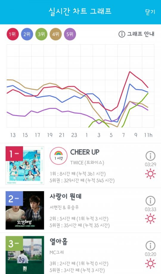 특히 ‘트와이스’의 ‘CHEER UP’은 음원강자들과의 신곡 경쟁 속에서도 거의 한달 가까운 시간 동안 차트 정상을 지키며 네티즌들로부터 압도적인 인기를 얻었다.