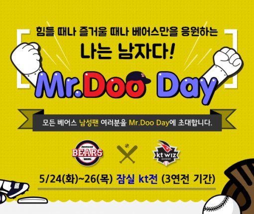 두산 베어스는 "24일부터 잠실에서 열리는 kt위즈와의 홈 3연전에 남성팬을 위한 맞춤형 이벤트인 '미스터두데이(Mr.Doo Day)'를 진행한다"고 20일 밝혔다.