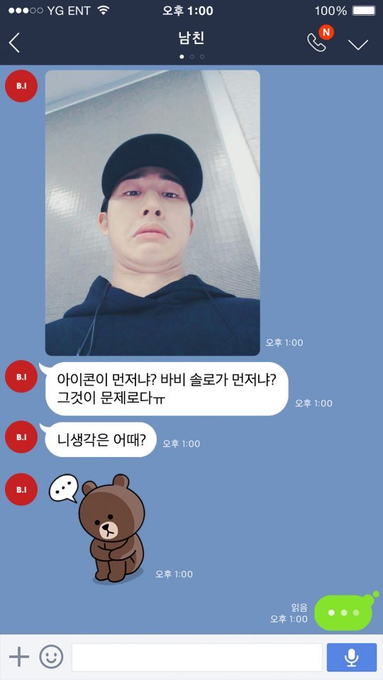 그룹 아이콘 리더 B.I와 멤버 정찬우가 동시에 '남친짤'과 함께 메신저 메시지를 공개했다.