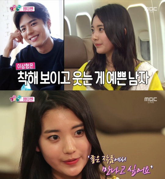 정다빈은 22일 방송된 MBC ‘섹션TV 연예통신’에서 이상형으로 박보검을 지목하며 “그렇게 생긴 분이 좋다. 웃는 게 멋있고 착해보인다”고 말했다.