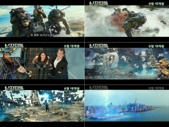 이번에 공개된 예고편은 수천 미터 상공을 비행하는 항공기에서 뛰어내리는 닌자터틀 4총사의 모습으로 시작한다. 4인 4색 복면만큼이나 개성 있는 닌자터틀 답게 점프를 앞둔 자세 또한 가지각색으로, 보는 이에게 시작부터 큰 재미를 선사한다. 이어서 펼쳐지는 브라질 마나우스의 수천 미터에서의 고공 낙하와 휘몰아치는 급류 속 추격전까지를 아우르는 시원한 블록버스터 액션은 역시 ‘믿고 보는 마이클 베이’라는 말을 자아내기에 충분하다.