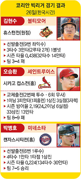 한편 세인트루이스 오승환(34)은 같은 날 부시스타디움에서 열린 시카고 컵스와 경기에서 4-6으로 뒤진 6회 등판해 1이닝 3안타(1홈런) 3실점으로 부진했다. 메이저리그 진출 후 첫 피홈런을 기록하며 9연속경기 무실점 행진이 끝났다. 세인트루이스도 8-9로 졌다. 미네소타 박병호(30)는 타깃필드에서 열린 캔자스시티전에서 6번 1루수로 선발 출장해 4타수 1안타 1타점을 기록했다. 최근 6경기에서 타율 0.048(21타수1안타)로 부진했지만, 이날 10경기 만에 타점을 올렸다. 팀도 7-5로 이기며 3연패에서 벗어났다. 피츠버그 강정호는 애리조나전에서 선발 라인업에 이름을 올리지 못했지만 9회초 대수비로 출전해 1이닝을 소화했다. 피츠버그는 5-4로 역전승했다.
