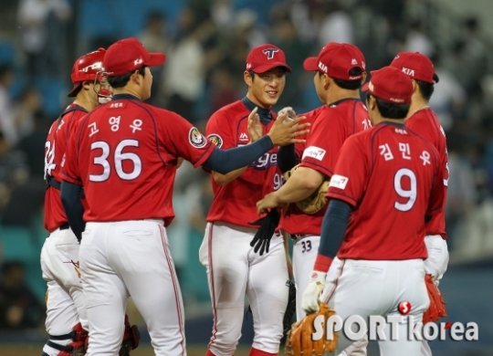 26일 오후 대구 삼성 라이온즈파크에서 `2016 프로야구` 삼성 라이온즈 대 KIA 타이거즈 경기가 열려 KIA가 삼성에 9대 2로 승리해 위닝시리즈를 가져갔다. 경기종료 후 KIA 선수들이 승리의 기쁨을 나누고 있다.