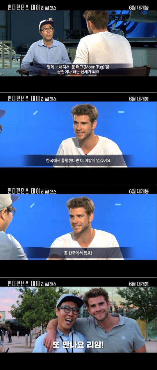 작년 여름 글로벌 런칭 파티가 열린 미국 뉴 멕시코주 앨버커키에 위치한 영화 촬영 현장에 개그맨 김영철이 대한민국 대표 인터뷰자로 다녀왔다. 이번 현장 방문에서는 영화 ‘인디펜던스 데이: 리써전스’의 전편인 ‘인디펜던스 데이’ 시사 참여 및, 영화 제작 축하 파티, 배우들의 글로벌 기자간담회 등 쉴 틈 없이 스케줄에 대거 참여했다. 여기에 ‘인디펜던스 데이: 리써전스’의 조종사 ‘제이크 모리슨’ 역할을 맡은 리암 헴스워스를 전격 인터뷰 했다.