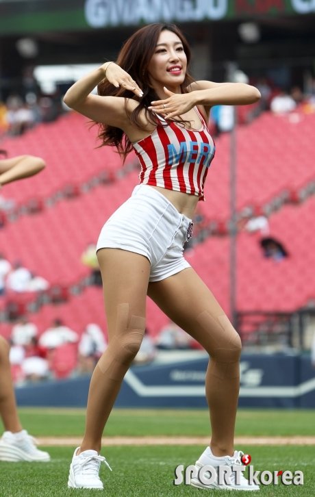 29일 오후 광주-기아 챔피언스필드에서 열린 `2016 타이어뱅크 KBO 리그` 프로야구 KIA 타이거즈와 NC 다이노스의 경기에서 KIA 치어리더 김청이 5회말을 마치고 크리닝 타임 때 그라운드에서 공연을 펼치고 있다.