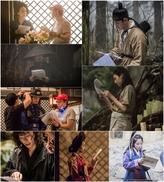 조선의 엄친아 풍연 역을 통해 훈남 포스를 발휘중인 곽시양은 대본을 볼 때도 우월한 비주얼이 눈에 띈다. 중전에서 대비가 된 심씨역을 통해 절절한 감정 연기를 펼치고 있는 장희진 역시 무거운 가채도 아랑곳 않고 대본에 몰입하고 있다.