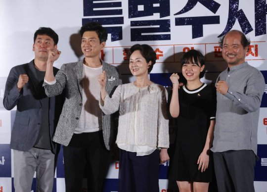 감독 권종관, 배우 김명민. 김영애, 김향기, 김상호(왼쪽부터)가 31일 오후 서울 왕십리 한 멀티플렉스에서 열린 영화 특별수사 사형수의 편지 언론시사회에서 포토타임을 하고 있다.