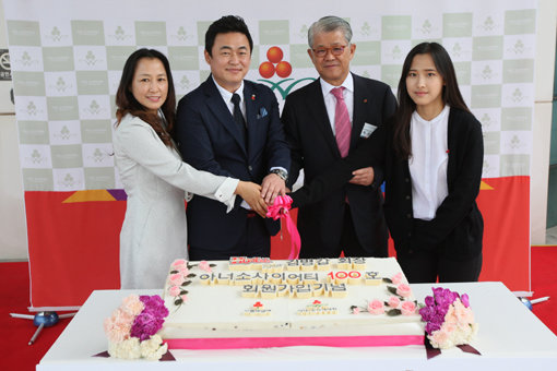㈜훌랄라 김병갑 회장(왼쪽에서 두 번째)이 30일 고액 기부자 클럽인 경기 아너 소사이어티 100호 회원으로 가입한 뒤 전국 아너 소사이어티 최신원(SK네트웍스 회장) 총대표(왼쪽에서 세 번째), ㈜훌랄라 최순남 부사장(맨 왼쪽)과 함께 기념 떡 케익을 커팅하고 있다. 사진제공|훌랄라