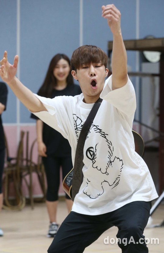 뮤지컬 배우 김성규가 1일 오후 서울 종로구 아리온 연습실에서 열린 뮤지컬 올슉업 연습현장 공개에서 하이라이트를 시연하고 있다.