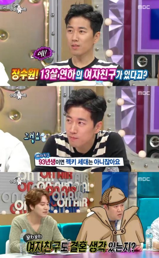 장수원은 이날 "13살 연하 여친과 잘 만나고 있다. 여자친구는 내가 젝스키스였던 걸 몰랐다. 그냥 연기 못하는 배우로만 알고 있었다"고 여자친구를 소개했다.