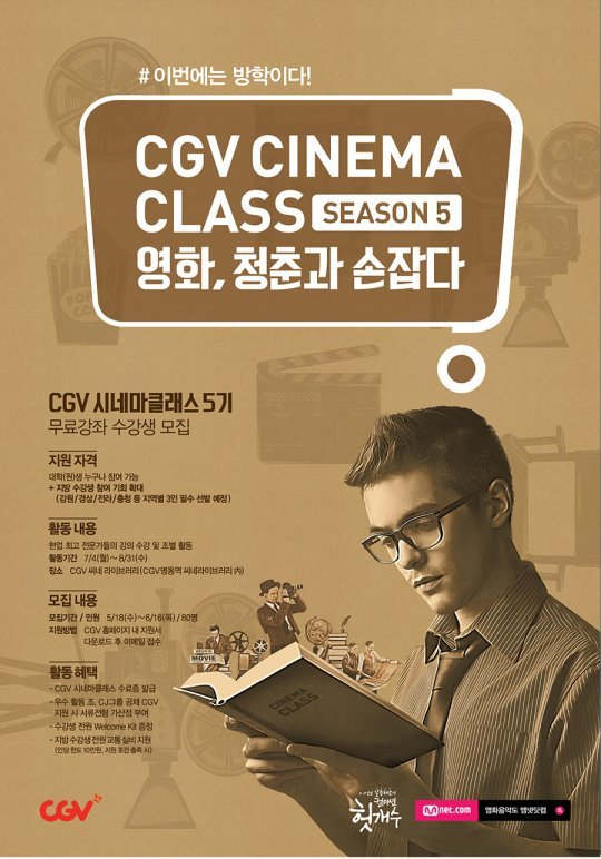 CGV가 현업 최고의 전문가와 함께하는 무료 영화 강좌 ‘CGV 시네마클래스’ 5기 수강생을 모집한다고 밝혔다. 7월 4일(월)부터 8월 31일(수)까지 약 9주 간 CGV 씨네 라이브러리(CGV명동역 씨네라이브러리 內)에서 개최되는 이번 클래스는 서울•수도권 외 지역 학생들의 참여를 위해 방학 중에 진행하며, 지원 조건 충족 시 지역 학생들에 교통 실비를 일부 지원한다.