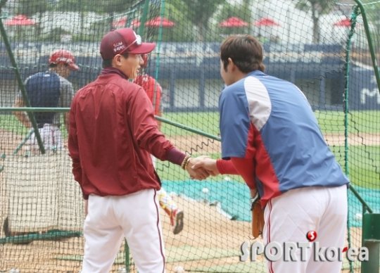 3일 오후 광주-기아 챔피언스필드에서 열린 `2016 프로야구` KIA 타이거즈 대 넥센 히어로즈 경기에 앞서 넥센 염경엽 감독이 KIA 서동욱과 악수를 나누고 있다.
