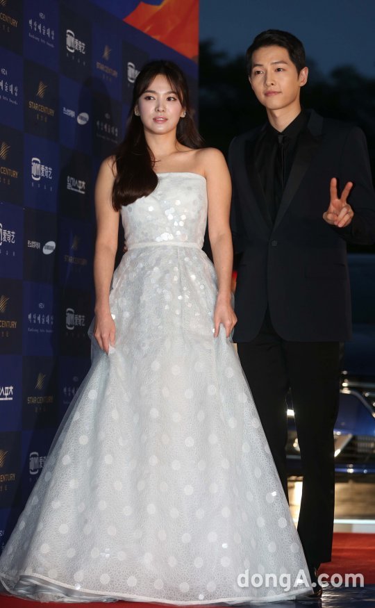 배우 송혜교(왼쪽)와 송중기가 3일 오후 서울 경희대 평화의전당에서 열린 제52회 백상예술대상에 참석하기 위해 레드카펫을 밟고 있다.