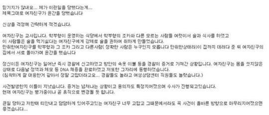 글에 따르면 “여자친구는 교사다. 학부형이 운영하는 식당에서 학부형의 조카 등 다른 사람들과 식사를 했다. 학부형들은 술을 먹기 싫다는 여자친구에게 억지로 술을 권해 취하게 만들었다”고 전했다.