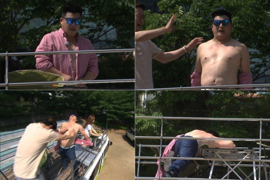 “야외 태닝을 하겠다”며 한 치의 망설임도 없이 상의를 탈의한 윤정수는, “김숙이 내 알몸을 보고 속살이 너무 하얗다고 놀렸다. 이참에 태닝을 하겠다”며 상반신 노출을 선보였다.