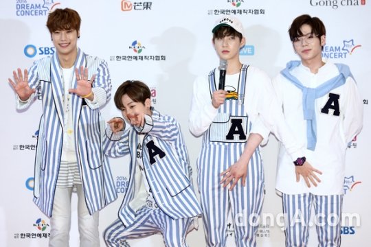 그룹 에이션이 4일 오후 서울 마포구 상암월드컵경기장에서 열린 ‘2016 드림콘서트’ 레드카펫 행사에 참석해 포토타임을 하고 있다.
