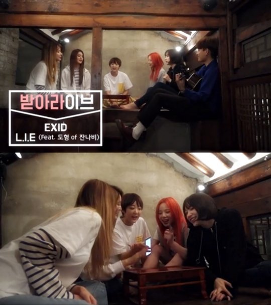 EXID는 지난 6일 공식 페이스북을 통해 라이브 영상 이벤트를 게재했다. 공개된 영상에서 EXID는 밴드 잔나비의 멤버 김도형의 기타 반주에 맞춰 지난주 발표한 흥겨운 댄스곡 ‘L.I.E(엘라이)’를 어쿠스틱 버전으로 편곡해 라이브로 불렀다.