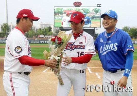 10일 오후 광주-기아챔피언스필드에서 열린 `2016 타이어뱅크 KBO 리그` 프로야구 KIA 타이거즈와 삼성 라이온즈의 경기에 앞서 지난달 29일 역대 40번째로 2,000루타를 달성한 KIA 김주찬의 시상식이 있었다. 시상식에서 양 팀의 주장인 이범호와 박한이가 김주찬에게 축하의 꽃다발을 전달하고 있다.