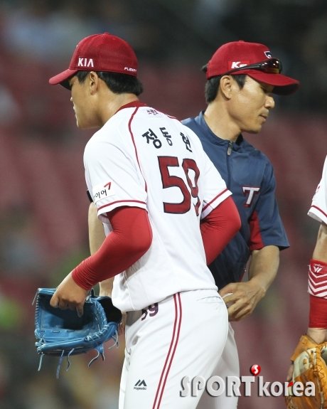 10일 오후 광주-기아챔피언스필드에서 열린 `2016 타이어뱅크 KBO 리그` 프로야구 KIA 타이거즈와 삼성 라이온즈의 경기에서 KIA 선발 투수 정동현이 6회초 1사 1루에서 삼성 5번 박한이를 중견수 플라이로 처리한 뒤 마운드에서 물러나고 있다. 정동현은 전상현이 이닝을 마무리하며 5.2이닝 동안 5피안타 무실점의 호투를 펼쳐 승리요건을 갖추게 됐다.