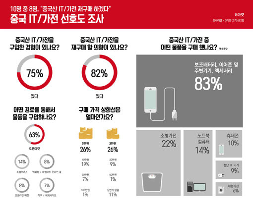 오픈마켓 G마켓은 지난 3일부터 10일까지 총 692명의 고객을 대상으로 설문조사(사진)를 실시한 결과 이처럼 나타났다고 13일 밝혔다. 설문 결과 샤오미와 화웨이, 하이얼 등 중국 브랜드 IT·가전제품을 구매한 경험이 있는 고객은 75%에 달했다. 이들 중 82%가 재구매 의사를 나타냈다. 또 구매 경험은 없지만 앞으로 ‘구매 의향이 있다’고 답한 고객도 절반(51%)을 넘었다.