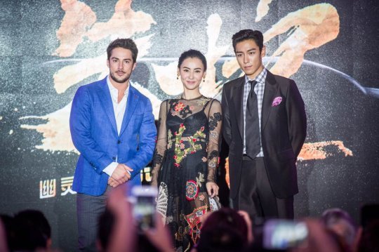 지난 14일 오후 탑은 중국 상하이에서 개최된 영화 ‘아웃 오브 컨트롤’ 기자회견에 여주인공인 장바이즈(장백지), 감독 마이클 트레비노와 함께 참석했다.