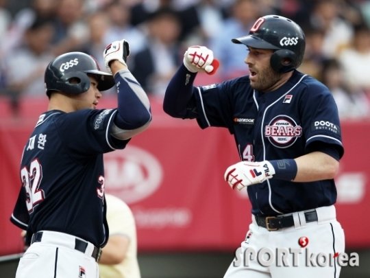 16일 오후 광주-기아챔피언스필드에서 열린 `2016 타이어뱅크 KBO 리그` 프로야구 KIA 타이거즈와 두산 베어스의 경기 두산 2회초 무사 1루에서 5번 에반스가 좌중월 투런홈런을 치고 홈인하며 김재환과 세레모니를 펼치고 있다.