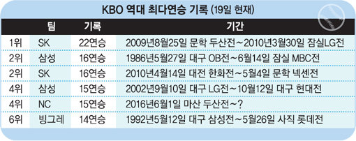 한편 1위 두산도 삼성을 3-1로 잡고 NC와 3.5경기차를 지켰다. 롯데와 KIA도 LG, SK를 각각 10-3, 9-5로 잡고 중위권 싸움에 가세했다. 반면 꼴찌 한화는 이해하기 어려운 마운드 운영 끝에 넥센에 6-11로 대패했다.