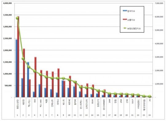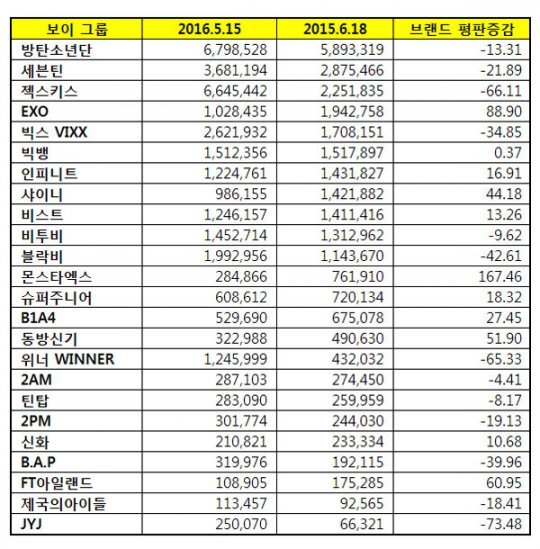 6위부터 10위까지는 빅뱅, 인피니트, 샤이니, 비스트, 비투비 순이다.