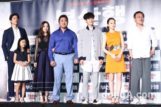 배우 공유(왼쪽부터), 김수안, 정유미, 마동석, 최우식, 안소희, 김의성이 21일 오전 서울 종로구 그랑서울에서 열린 영화 ‘부산행’ 제작발표회에 참석해 포토타임을 하고 있다.