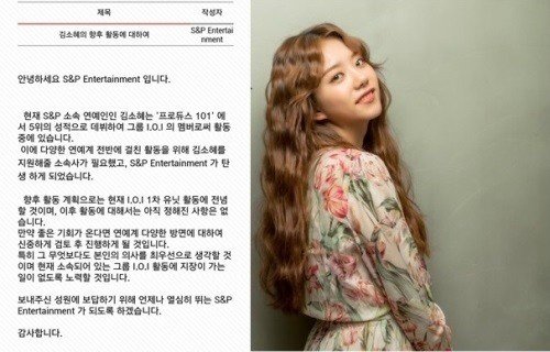 공식입장에서 S&P 측은 ”I.O.I 멤버로 활동 중에 있는 김소혜의 연예계 전반에 걸친 활동을 위해 지원해줄 소속사가 필요했다. 이에 S&P Entertainment가 탄생하게 됐다”고 설명했다.