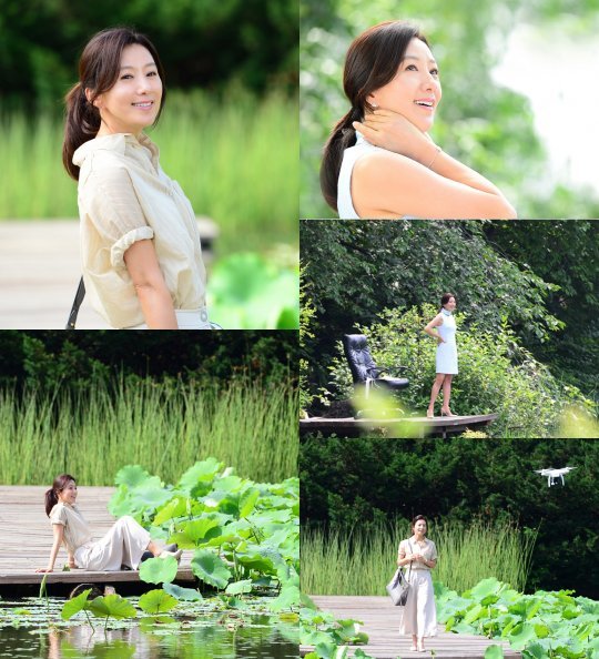 특히 대본에 ‘다시 태어난 기분으로 마음껏 자연을 만끽하며 둘러본다’라는 지문대로 김희애는 의자에서 일어나 숨을 크게 들이마시면서 미소지었다. 그러다 폭포 옆을 자연스럽게 걷던 그녀는 어느덧 나무바닥에 앉은 뒤 연꽃을 만지면서 행복해하는 연기를 했다.