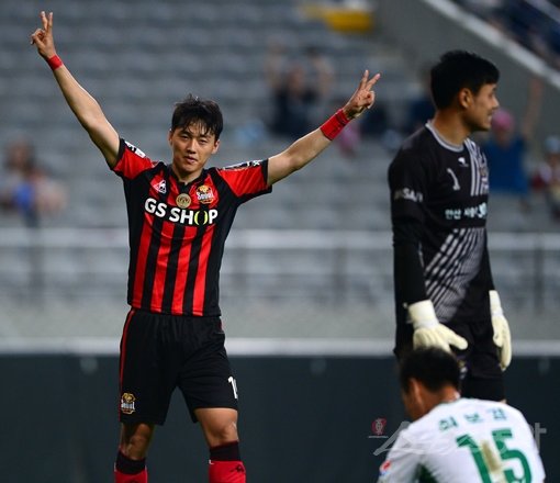 FC서울 윤주태가 22일 서울월드컵경기장에서 벌어진 안산무궁화와의 FA컵 16강전에서 2골을 몰아치며 팀을 8강으로 이끈 뒤 ‘승리의 V’를 그리며 기뻐하고 있다. 상암|김진환 기자 kwangshin00@donga.com