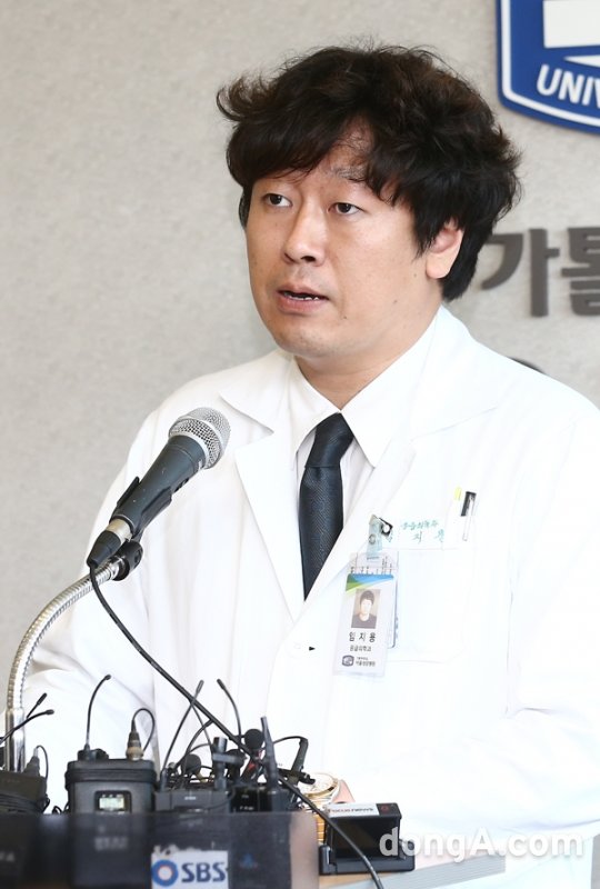 서울성모병원 임지용 교수가 26일 오후 서울 서초구 서울성모병원에서 진행된 배우 김성민 뇌사판정과 장기기증에 관련한 브리핑을 하고 있다.