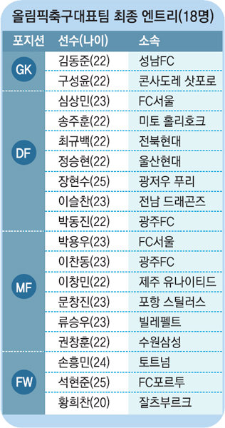 올림픽축구대표팀 신태용(46) 감독은 27일 기자회견을 열고 18명의 리우올림픽 최종 엔트리를 공개했다. 석현준은 또 다른 와일드카드 손흥민(24·토트넘), 황희찬(20·잘츠부르크)과 나란히 3명의 공격수(FW) 명단에 이름을 올렸다.