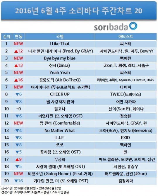 온라인 음원 포털 소리바다(대표 손지현, www.soribada.com)는 씨스타의 ‘I Like That’이 6월 4주차 (6월 20일 ~ 6월 26일) 주간차트에서 1위를 차지했다고 밝혔다. 이 곡은 은밀하고 차분한 섹시함으로 그녀들의 색다른 모습을 보여주었고, 5위에 랭크되어 있는 ‘Yeah Yeah’는 경쾌하고 시원한 정통 씨스타표 여름 댄스 곡으로 다른 느낌의 두 곡 모두 대중들의 마음을 사로잡고 있다.