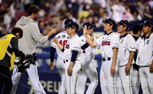 28일 서울 잠실야구장에서 ‘2016 타이어뱅크 KBO 리그’ NC다이노스와 두산베어스 경기가 열렸다. 12-3 대승을 거둔 두산 김태형 감독이 선수륻과 하이파이브 하고 있다. 잠실|김종원기자 won@donga.com