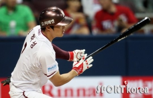 1일 오후 서울 고척스카이돔에서 열린 `2016 타이어뱅크 KBO 리그` 프로야구 넥센 히어로즈와 KIA 타이거즈의 경기 넥센 3회말 무사 만루에서 3번 김하성이 2타점 적시타를 때리고 있다