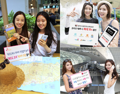 이동통신 3사가 여름 휴가철 프로모션에 나섰다. SK텔레콤은 관광객들을 겨냥한 ‘제주도 프리’ 데이터, KT는 워터파크 및 놀이동산 혜택, LG유플러스는 로밍시 커피·영화 쿠폰을 제공하는 이벤트를 진행한다(맨 왼쪽부터 시계방향으로). 사진제공|SK·KT·LG
