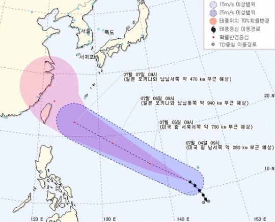 대만 부근 해역을 지나면서 고기압의 수축정도에 따라 중국 남동부지역으로 움직일 가능성이 크지만 우리나라 쪽으로도 북상할 가능성이 있기 때문에 주의가 필요하다고 기상청은 전했다.