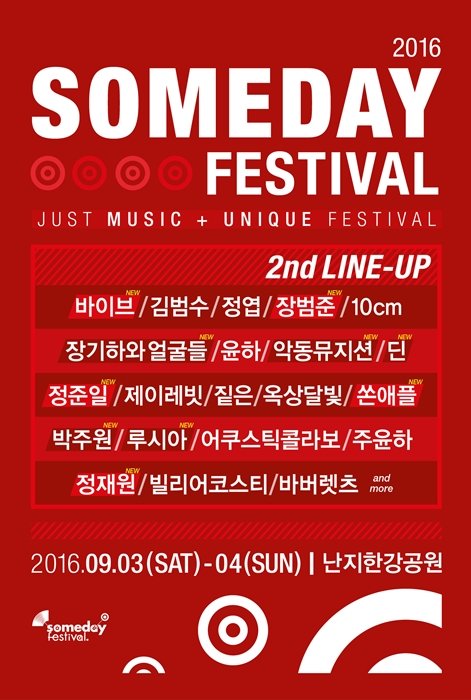 2016년 가을, 국내 최고의 아티스트와 관객이 함께 만들어가는 'Someday Festival 2016'은 2016년 9월 3일, 4일 양일간 서울 난지한강공원에서 개최되며, 얼리버드 티켓은 오는 7월 7일 목요일까지 인터파크티켓을 통해 예매 할 수 있다.