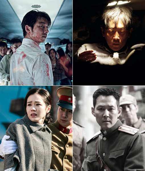 여름시즌을 맞아 극장가가 서서히 달아오르고 있다. ‘재난’을 소재로 한 좀비영화 ‘부산행’, 터널에 갇힌 한 남자의 사투를 그리는 영화 ‘터널’, 실존인물을 다루는 영화 ‘인천상륙작전’ ‘덕혜옹주’(왼쪽상단부터 시계방향으로)가 각각 관객을 찾아간다. 사진제공|영화사 레드피터·어나더썬데이·태원엔터테인먼트·호필름