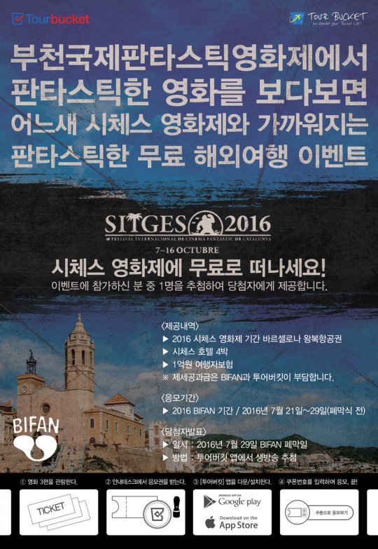 BIFAN과 투어버킷이 함께하는 이번 이벤트는 세계 3대 판타스틱 영화제 중 하나인 시체스 국제 영화제(SITGES International Fantastic Film Festival)가 열리는 바르셀로나 왕복 항공권과 3성 호텔 4박 5일 숙박권 및 여행자 보험을 이벤트 당첨자 1명에게 제공할 예정이다.