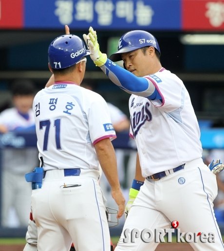 5일 오후 대구 삼성 라이온즈파크에서 열린 `2016 프로야구` 삼성 라이온즈 대 LG 트윈스 경기 1회말 1사에서 삼성 박한이가 선제 솔로홈런을 쳐 홈을 밟은 후 김평호 1루코치의 환영을 받고 있다.