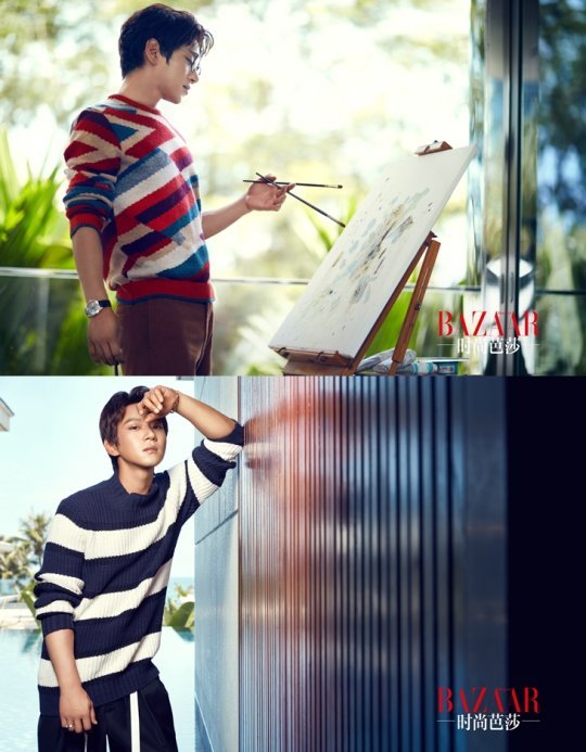특히 한 손에 두 개의 붓을 들고 캔버스에 진지하게 그림을 그리고 있는 모습은 마치 ‘미대오빠’를 연상케 한다. 또 풀장을 배경으로 벽에 기대어 그윽한 눈빛으로 카메라를 응시하며 훈훈한 매력과 부드러운 카리스마를 동시에 발산하며 여심을 자극했다.