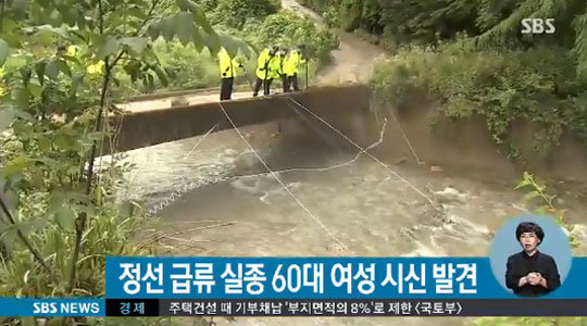 사진|정선 급류 실종 60대 여성 시신 발견. SBS 뉴스 캡처