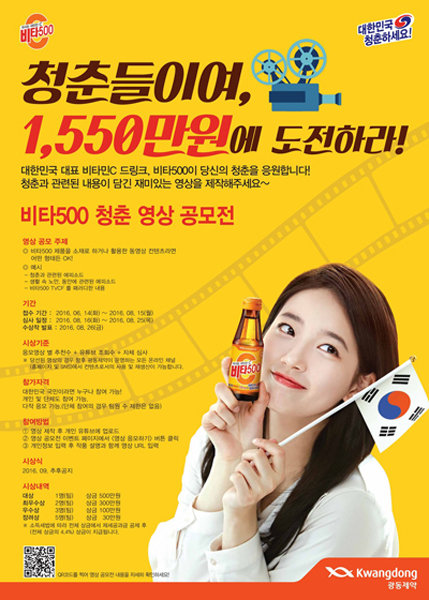 광동제약은 ‘비타500청춘 영상 공모전’에 참여한 응모자 가운데 선착순 80 명에게 비타500 100병을 주고 영상 공모전을 개인 SNS에 홍보하면 추첨을 통해서도 비타500을 경품으로 준다. 광동제약 비타500은 ‘대한민국 청춘하세요’를 주제로 광고 캠페인을 진행 중이다.