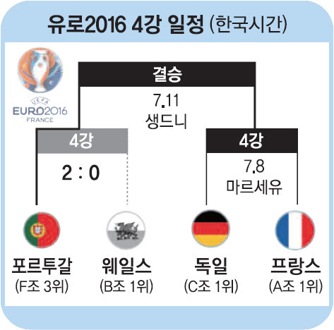 포르투갈은 7일(한국시간) 스타드 드 리옹에서 벌어진 웨일스와의 2016유럽축구선수권대회(유로2016) 준결승에서 2-0으로 이겼다. 11일 열릴 결승에 선착한 포르투갈은 자국에서 펼쳐졌던 유로2004 이후 12년 만에 다시 결승에 올라 대회 첫 패권에 도전할 수 있게 됐다.